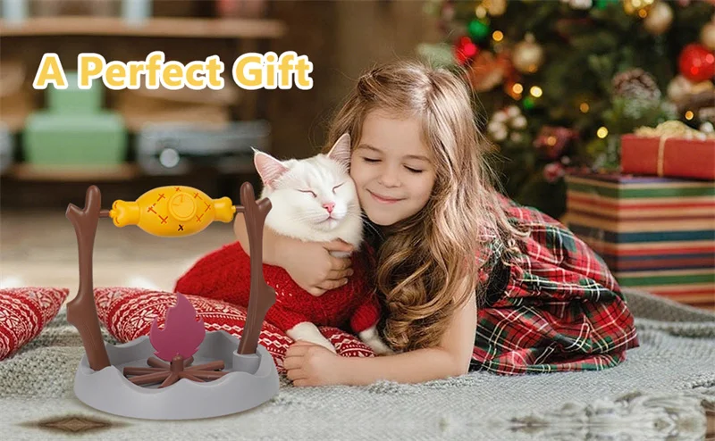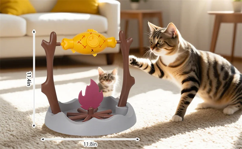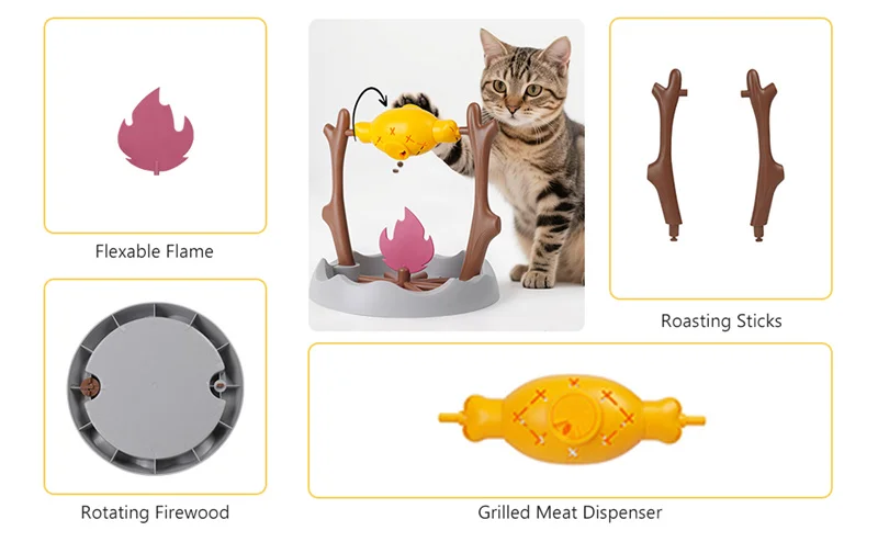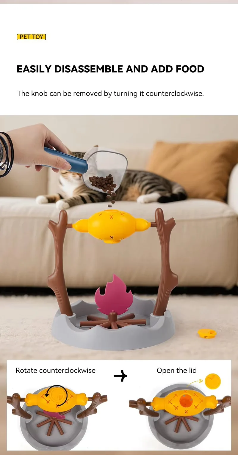 🌀 Interactive Rotating Design – As your cat nudges and plays with the feeder, the grill-like campfire design rotates to dispense treats or kibble through adjustable holes — keeping them entertained and motivated!
